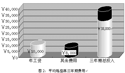 就中國目前的經濟水平而言,一個座席人員年收入(包括工資、獎金、福利等等)大約為¥10,000,而每個座席人員所配備的軟硬件設施合計約為¥5,000;據(jù)專業(yè)機構統(tǒng)計,中國的座席人員平均穩(wěn)定的工作年限為三年,而在這三年為了保證座席人員能夠準確、高效的實現(xiàn)對用戶提供專業(yè)服務,所投入的培訓費用大約為¥3,000。所以在三年期間為每個座席的平均花費為¥38,000。