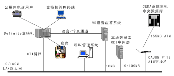浦東機(jī)場(chǎng)呼叫中心系統(tǒng)建有本地?cái)?shù)據(jù)庫(kù),但有許多信息需與中央數(shù)據(jù)庫(kù)交換。所以依托高速的ATM主干網(wǎng)絡(luò),利用基于TCP/IP網(wǎng)絡(luò)協(xié)議的CDI(CEDA Data Interface)通信方式作為中間件,進(jìn)行本地?cái)?shù)據(jù)庫(kù)與中央數(shù)據(jù)庫(kù)之間的信息交互和共享,完成本系統(tǒng)與機(jī)場(chǎng)信息集成系統(tǒng)的中央數(shù)據(jù)庫(kù)連通。