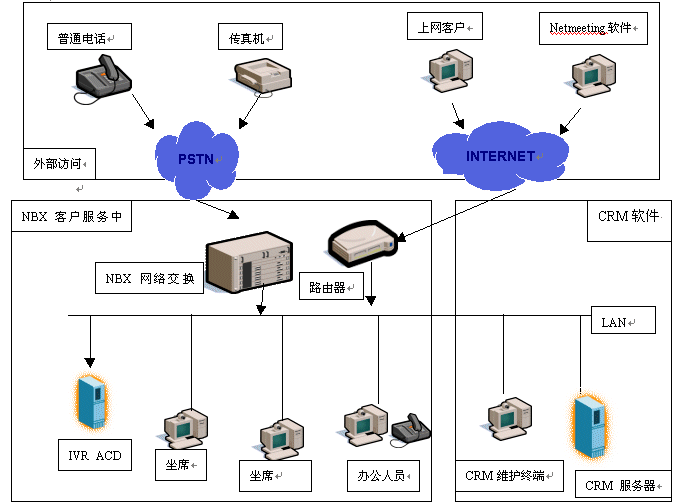 NBX客戶服務(wù)中心是基于3Com公司的NBX網(wǎng)絡(luò)電話交換機(jī)平臺(tái)構(gòu)筑的新一代呼叫中心,首先它擴(kuò)大了服務(wù)方式,客戶不但可以通過(guò)電話得到服務(wù),還可以在上網(wǎng)訪問(wèn)企業(yè)主頁(yè)的同時(shí)使用耳機(jī)、麥克風(fēng)直接與服務(wù)代理人員(AGENT)語(yǔ)音通話,一邊瀏覽網(wǎng)頁(yè),一邊交談,增加交流的信息輔助量。還可以通過(guò)電子郵件、傳真等方式完成與企業(yè)信息交流,其次NBX客戶服務(wù)中心內(nèi)部數(shù)據(jù)、語(yǔ)音兩網(wǎng)合一的布線結(jié)構(gòu),不但提高了呼叫中心的穩(wěn)定性,而且使客戶數(shù)據(jù)能與電話語(yǔ)音同步協(xié)調(diào),完成具有針對(duì)性的一對(duì)一的客戶服務(wù)。