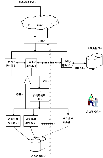 當(dāng)用戶通過(guò)電話向聲訊服務(wù)器發(fā)出請(qǐng)求時(shí),聲訊服務(wù)器會(huì)首先作出分析判斷,然后從內(nèi)容數(shù)據(jù)庫(kù)中提取相應(yīng)的文本信息,經(jīng)過(guò)負(fù)載平衡機(jī)制發(fā)送給語(yǔ)音合成服務(wù)器。語(yǔ)音合成服務(wù)器在接收到文本后立刻開(kāi)始合成,同時(shí)將合成好的語(yǔ)音發(fā)送回語(yǔ)音服務(wù)器,再由語(yǔ)音服務(wù)器回傳給用戶。其中內(nèi)容數(shù)據(jù)庫(kù)中的信息可以由系統(tǒng)管理員定期進(jìn)行維護(hù)管理。(系統(tǒng)連接結(jié)構(gòu)見(jiàn)流程圖)