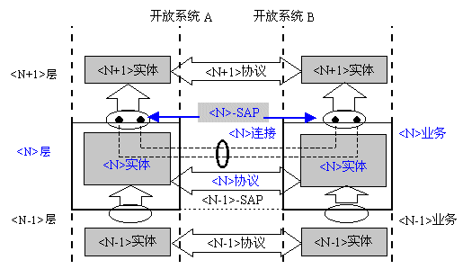 《N》層的信息交換在各開放系統(tǒng)《N》層的信息交換實(shí)體(Entity,稱《N》實(shí)體)間進(jìn)行!禢》實(shí)體按照《N》協(xié)議和其他《N》實(shí)體共同完成《N》功能!禢+1》實(shí)體利用《N》實(shí)體提供的功能完成相互間的通信!禢》層向《N+1》提供的通信功能稱作《N》業(yè)務(wù)!禢》實(shí)體向《N+1》實(shí)體提供《N》業(yè)務(wù)的邏輯接口稱為《N》業(yè)務(wù)接入點(diǎn),記為《N》-SAP(Service Access Point),位于各層的邊界上。相鄰層的通信實(shí)體間通過原語(Primitive)及其相關(guān)參數(shù)進(jìn)行。原語包括:來自上層的請(qǐng)求(Request)和響應(yīng)(Response),來自下層的指示(Indication)和證實(shí)(Confirmation)四種。在這種相對(duì)獨(dú)立的層間及層內(nèi)邏輯結(jié)構(gòu)下,開放系統(tǒng)的對(duì)等實(shí)體可以無需關(guān)心其上下層功能的實(shí)現(xiàn)方式,于是它們之間的信息交互進(jìn)一步抽象為一種邏輯連接,稱為《N》連接。