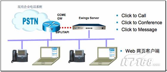 UC點點通解決方案,由網(wǎng)關(guān),服務(wù)器,IP電話和客戶端組成,如圖5所示: