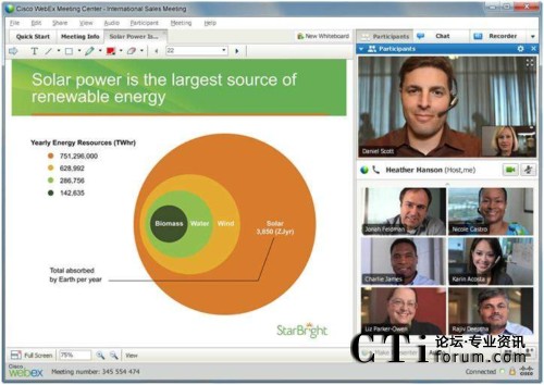 隨著支持高質(zhì)量視頻的思科WebEx™ Meeting Center的推出,與會者將能夠在全屏視頻模式下非常清晰的看到其他與會人員,從而使網(wǎng)絡(luò)會議變成一個虛擬視頻會議室。除了能夠通過高清晰度的全屏顯示看到發(fā)言者外,用戶還能同時共享桌面,并通過思科的 WebEx One Touch輕松接入思科網(wǎng)真會議。思科WebEx還提供ActivePresence功能,可沿屏幕底部以條狀顯示所有與會者。當(dāng)前的發(fā)言者以全屏顯示,并保持與參會者之間的視頻交互。借助語音激活轉(zhuǎn)換功能,當(dāng)另一個與會者開始發(fā)言時,他將被轉(zhuǎn)為全屏顯示狀態(tài)。思科網(wǎng)真終端也支持ActivePresence功能。