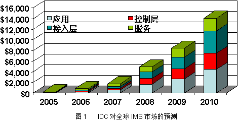 IMS作為一個(gè)通信架構(gòu),開創(chuàng)了全新的電信商業(yè)模式,拓展了整個(gè)信息產(chǎn)業(yè)的市場空間。IMS正在成為新一輪的投資熱點(diǎn)。IDC認(rèn)為,IMS市場將從目前的數(shù)百萬美元迅速增長到2010年的141億美元(如圖1)。對于電信行業(yè)來說,IMS的意義甚至超出了3G或4G,它將重新定義未來的通信業(yè)務(wù)。