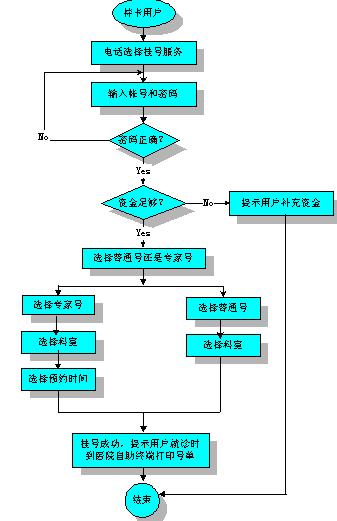 用戶選擇普通門診,系統(tǒng)繼續(xù)提示"請選擇科目,1內(nèi)科,2外科,3五官科,……,"用戶選擇完畢。系統(tǒng)提示:"您要掛的是*科,確認(rèn)按1,重輸按2",用戶按1,系統(tǒng)繼續(xù)提示:"本院已經(jīng)為您記錄并生成號單,請于當(dāng)日及時到醫(yī)院自助終端打印號單后就診。"