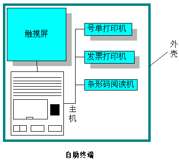 自助終端的結(jié)構(gòu)主要分為6個部分:主機、觸摸屏、條形碼閱讀機、號單打印機、發(fā)票打印機和外殼。