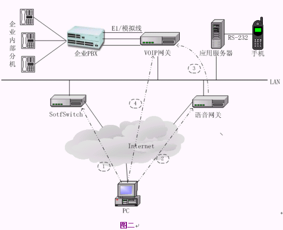 用戶使用系統(tǒng)時,需要先下載終端并安裝到PC上,然后在終端上撥企業(yè)內(nèi)部的分機號碼就可以了。對于一般的企業(yè),VoIP語音網(wǎng)關(guān)可以配置幾條模擬線到一個E1的規(guī)模,SoftSwitch、語音網(wǎng)關(guān)、應用服務器可以安裝在一臺PC或PC服務器上,或者與企業(yè)的其它服務器(如代理服務器)合用,另外需要一到兩個公網(wǎng)IP地址資源。系統(tǒng)的硬件和網(wǎng)絡成本非常低,整個系統(tǒng)如果按一個E1(30路)容量計算,配置VoIP網(wǎng)關(guān)和一臺PC服務器,硬件價格不超過3萬元,如果VoIP網(wǎng)關(guān)支持隧道模式傳送信令和語音,則語音網(wǎng)關(guān)也可以省去。