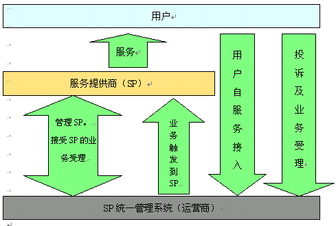 在對SP統(tǒng)一管理的過程中,SP、新太科技、運(yùn)營商、運(yùn)營商用戶組成了一條完整的價值鏈,如下圖所示: