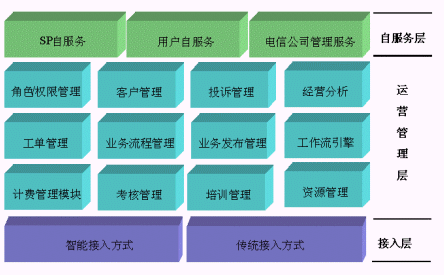 SP統(tǒng)一管理系統(tǒng)從功能邏輯上劃分,我們歸納為三大功能層來對系統(tǒng)進(jìn)行總體的介紹:接入層、運(yùn)營管理層、自服務(wù)層。如下圖所示: