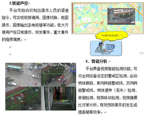 由于海量視頻信息的出現(xiàn),要求平臺(tái)能利用智能視頻技術(shù)來(lái)解決傳統(tǒng)視頻監(jiān)控系統(tǒng)所無(wú)法解決的問題。如智能檢索、人臉識(shí)別、車牌識(shí)別、運(yùn)動(dòng)軌跡跟蹤、行為模式分析等,變“被動(dòng)監(jiān)控”為“主動(dòng)監(jiān)控”,以提升視頻監(jiān)控系統(tǒng)的應(yīng)用成效,降低管理成本。