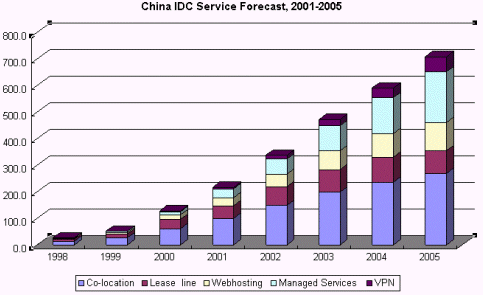 Frost & Sullivan研究表明,在2000年,中國IDC市場(chǎng)規(guī)模約為1億2千萬美圓,預(yù)測(cè)到2005年,將達(dá)到7億美圓。從2000年到2005年間,中國IDC市場(chǎng)的年平均復(fù)合增長率將達(dá)42.3% 。