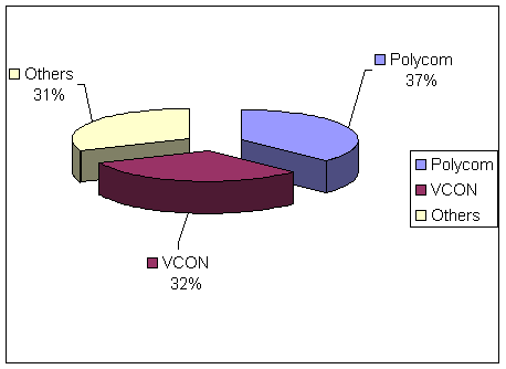 表4和圖3顯示了2001年桌面視頻會(huì)議市場(chǎng)競(jìng)爭(zhēng)廠商銷售額市場(chǎng)份額,表2和圖2顯示了銷售量的市場(chǎng)份額。隨著新產(chǎn)品的和新廠商的進(jìn)入,競(jìng)爭(zhēng)態(tài)勢(shì)將在未來(lái)不斷變化。目前該市場(chǎng)上兩個(gè)最大的廠商是Polycom和VCON, 其他一些小廠商市場(chǎng)份額較小。