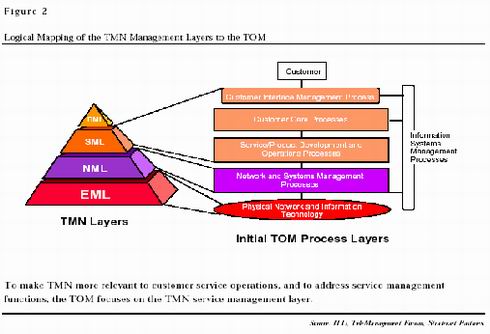 國際電聯(lián)的出發(fā)點雖好,但它更強(qiáng)調(diào)從網(wǎng)絡(luò)元素層開始的清晰的統(tǒng)一體系,而為了保護(hù)自己的商業(yè)秘密,各大運(yùn)營商往往不希望公開自己的網(wǎng)絡(luò)元素層的標(biāo)準(zhǔn),同時,網(wǎng)絡(luò)元素層的標(biāo)準(zhǔn)化對運(yùn)營商的業(yè)務(wù)發(fā)展幫助不大。在熱烈討論了一段時間之后,TMN漸漸被忽視了。而另一只希望從技術(shù)角度解決管理問題的力量,電信管理論壇,卻帶有一定偶然性地逐漸確立了自己的地位。電信管理論壇在開始的時候并沒有夢想能建立覆蓋整個電信運(yùn)營企業(yè)的管理系統(tǒng),其初衷是解決在當(dāng)時日漸突出的跨企業(yè)的客戶數(shù)據(jù)交換問題。因此,和國際電聯(lián)不同,電信管理論壇從開始就非常強(qiáng)調(diào)實用性,并把目光集中到了各企業(yè)相互間有大量數(shù)據(jù)交換,因此迫切需要建立標(biāo)準(zhǔn)的服務(wù)管理層和網(wǎng)絡(luò)管理層,并提出了電信運(yùn)營支持系統(tǒng)(OSS)的概念,并公布了模塊化的電信運(yùn)營導(dǎo)圖(TOM)。