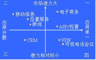 。〉谌笙蓿菏袌鰸摿Ρ容^小,應(yīng)用比較分散。由于經(jīng)營靈活,貼近客戶,小服務(wù)提供商在此會有非常大的優(yōu)勢。大型運(yùn)營商如想經(jīng)營此象限內(nèi)的業(yè)務(wù),必須努力減小不同用戶需求的差異,并造成成本領(lǐng)先。如客戶關(guān)系管理(CRM)。