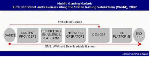 如果市場潛力足夠大,那么選擇適當(dāng)?shù)臉I(yè)務(wù)模式就是實現(xiàn)市場潛力的保證。而業(yè)務(wù)模式的選擇是與業(yè)務(wù)的市場價值鏈分不開的。在一些市場價值鏈較復(fù)雜的應(yīng)用中,業(yè)務(wù)模式的選擇尤為重要,例如,下圖所示的移動游戲的價值鏈就是較復(fù)雜的一個:
