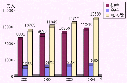 2001年,中國大陸中學(xué)學(xué)生人數(shù)已達(dá)10765萬人,而且學(xué)生人數(shù)還在快速增長。初中學(xué)生人數(shù)以每年6.5%的速度增長,普通高中學(xué)生人數(shù)也以每年10%-11%的速度增長?梢钥闯觯逃袌鼍薮蟮臐摿蜕虣C。
