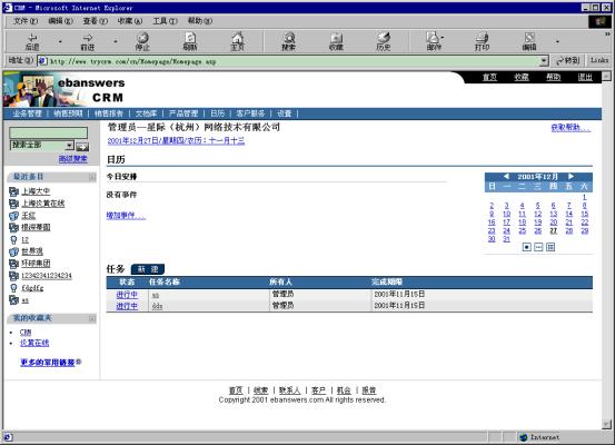 星際(杭州)網(wǎng)絡(luò)技術(shù)有限公司(www.ebanswers.com)研發(fā)的Ebanswers eCRM是中國第一套基于新一代網(wǎng)絡(luò)標(biāo)準(zhǔn)語言――XML的客戶關(guān)系管理系統(tǒng),整個(gè)系統(tǒng)提供了完善的企業(yè)級(jí)客戶關(guān)系全面解決方案,包含可無縫整合又可獨(dú)立運(yùn)行的三個(gè)功能組件:銷售,營銷,服務(wù)流程自動(dòng)化軟件系統(tǒng);客戶溝通集成信息化方案;深層商業(yè)智能分析。
