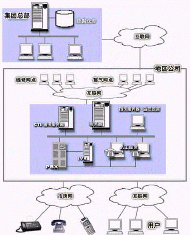各地區(qū)系統(tǒng)通過互聯(lián)網(wǎng)和下屬維修網(wǎng)點(diǎn)、銷售網(wǎng)點(diǎn)相連,構(gòu)成一個地區(qū)性服務(wù)網(wǎng)絡(luò)。各地區(qū)系統(tǒng)通過互聯(lián)網(wǎng)和集團(tuán)總部連接,構(gòu)成信息收集網(wǎng)絡(luò)。前者支持業(yè)務(wù)服務(wù),后者支持管理決策,共同構(gòu)成綜合公用事業(yè)服務(wù)平臺。