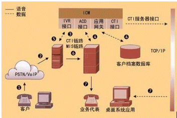 CTI (Computer Telephony Integration 計算機電信集成) 技術(shù)將計算機網(wǎng)和電話網(wǎng)連接在一起,把語音和數(shù)據(jù)服務(wù)集成為一體,使得構(gòu)造數(shù)據(jù)和語音的融合應(yīng)用得以實現(xiàn)。例如,由于CTI技術(shù)的引入,當(dāng)用戶來話時,呼叫中心能根據(jù)用戶的呼叫信息如ANI(主叫號)結(jié)合數(shù)據(jù)庫迅速地識別用戶,實現(xiàn)“彈屏”功能;當(dāng)電話轉(zhuǎn)接時,實現(xiàn)語音數(shù)據(jù)的同步轉(zhuǎn)移;根據(jù)所獲得的客戶信息及其他相關(guān)信息將來話路由到最適合服務(wù)的座席等。CTI技術(shù)包含了數(shù)據(jù)通信與語音通信兩大部分的內(nèi)容,關(guān)注的不僅僅是將基于計算機的智能技術(shù)運用到電話的發(fā)送、接收及管理,還要考慮各種媒體類型的信息傳送,包括實時信號和非實時信號,如傳真、電子郵件和視頻信號等。