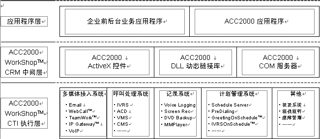 ACC2000 Workshop™是聲訊科技集團為基于Microsoft Windows操作系統(tǒng)的CRM應用軟件開發(fā)所建立的開發(fā)平臺(中間件)。以ACC2000 Workshop™為基礎的ACC2000集成多媒體溝通中心采用三層結(jié)構(gòu),利用ACC2000 Workshop™的CRM中間層所提供的ActiveX控件、DLL動態(tài)庫以及COM組件,就可以很容易地將溝通中心的各種功能融合到前端應用程序中。ACC2000 Workshop™的CTI執(zhí)行層接受中間件發(fā)來的請求,處理ACC2000的各項服務功能,并向CRM應用程序返回執(zhí)行結(jié)果。見下圖。