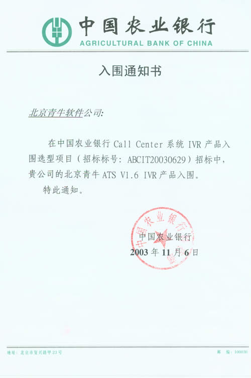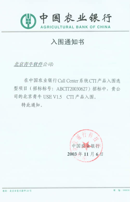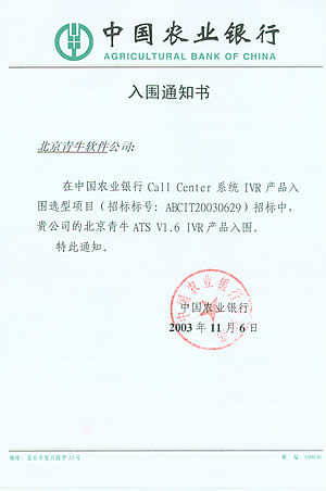 北京青牛軟件技術(shù)有限責(zé)任公司憑借多年來深厚的技術(shù)基礎(chǔ)、完善的咨詢服務(wù)和優(yōu)異的產(chǎn)品表現(xiàn),在本次CTI產(chǎn)品、IVR產(chǎn)品入圍選型項目中脫穎而出。青牛軟件此次入圍中國農(nóng)業(yè)銀行總行Call