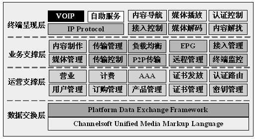 b) 針對電信和廣電市場,提供大型的分布式電信級IPTV解決方案。在技術(shù)架構(gòu)上為電信和廣電合作運營提供了強大的平臺支持,可以實現(xiàn)多家內(nèi)容和網(wǎng)絡(luò)運營商共享用戶、進行多級認證、雙方計費核對的復(fù)雜商業(yè)模式。主要應(yīng)用領(lǐng)域為基于IP寬帶網(wǎng)的交互網(wǎng)絡(luò)電視。