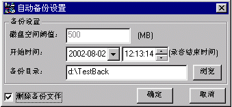 自動(dòng)備份由事先設(shè)定的磁盤(pán)空間報(bào)警閾值觸發(fā),它會(huì)發(fā)出信息提示或聲音提示,然后將用戶事先確定的時(shí)間范圍內(nèi)的錄音文件全部備份到客戶機(jī)硬盤(pán)、磁盤(pán)陣列或其他記錄介質(zhì)上,并且可以自動(dòng)刪除系統(tǒng)硬盤(pán)上已經(jīng)被備份出來(lái)的文件。