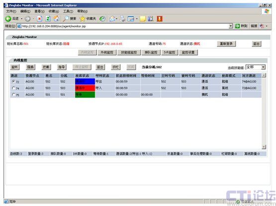 3.模塊界面劃分清晰:Monitor監(jiān)控模塊分為內(nèi)線監(jiān)控、外線監(jiān)控、虛通道監(jiān)控、技能組監(jiān)控和IVR監(jiān)控共五大類(lèi)。各類(lèi)別功能獨(dú)立運(yùn)行,可根據(jù)企業(yè)對(duì)聯(lián)絡(luò)中心班長(zhǎng)的職責(zé)劃分,對(duì)各類(lèi)技能組、項(xiàng)目組的班長(zhǎng)登錄提供有區(qū)別的監(jiān)控頁(yè)面,從而為每位班長(zhǎng)的恪盡職守提供了良好的保證。