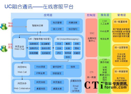 IM (Instant Messaging)即時消息是一種新興的互聯(lián)網(wǎng)交流方式,它具有實時性、在線性等一些很好的特性.目前IM已經(jīng)成為繼Email、Web之后的第三大互聯(lián)網(wǎng)應用,基于IM的各種應用、技術也在不斷的擴展;隨著網(wǎng)絡技術的飛速發(fā)展以及IM即時消息豐富的功能、成熟的應用、標準的接口協(xié)議、實時在線的溝通能力,IM進入聯(lián)絡中心的架構體系也是必然,IM也正在成為在線客服系統(tǒng)的一把“利器”。通過與聯(lián)絡中心的整合,實現(xiàn)統(tǒng)一排隊路由,統(tǒng)一的管控,在為客戶提供即時高效應答的同時,企業(yè)可隨時掌握整個交互過程與細節(jié),實現(xiàn)接入可管、流程可控、記錄可查的聯(lián)絡中心體系。