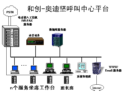 系統(tǒng)專線連接Internet網絡,客戶可以通過Internet網絡與座席人員進行電話交流。