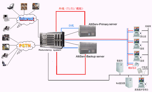 奧迪堅(jiān)通訊系統(tǒng)有限公司作為CTI通訊平臺的提供商,在技術(shù)上不斷創(chuàng)新,對產(chǎn)品精益求精,尤其體現(xiàn)在對系統(tǒng)的運(yùn)行安全性的要求上,為了防止電信接入設(shè)備或者企業(yè)網(wǎng)絡(luò)出現(xiàn)故障而造成的呼叫中心服務(wù)中斷,奧迪堅(jiān)呼叫中心系統(tǒng)提供安全保護(hù)冗余切換系統(tǒng),來保障呼叫中心在意外情況下的正常工作,該安全冗余切換系統(tǒng)通過對電源、T1/E1、模擬trunk、分機(jī)座席、以及各種網(wǎng)絡(luò)鏈路串口等備份切換來實(shí)現(xiàn)可靠的運(yùn)行。除此之外,奧迪堅(jiān)系統(tǒng)本身也提供強(qiáng)大的安全保障,由于采用先進(jìn)IP內(nèi)核一體化設(shè)計(jì),集傳統(tǒng)PBX、CTI服務(wù)器、IVR、ACD、Recording、FAX等眾多設(shè)備于一體,這樣有效的避免了因?yàn)橥鈷煸O(shè)備過多以及設(shè)備供應(yīng)商的不同而存在的兼容性的問題,從而降低了給呼叫中心系統(tǒng)帶來的的不穩(wěn)定的安全隱患。在系統(tǒng)之外依靠安全保護(hù)冗余切換系統(tǒng),可以實(shí)現(xiàn)外線、分機(jī)、以及各種鏈路接口的雙倍安全運(yùn)行。如上圖所示:兩臺奧迪堅(jiān)的呼叫中心服務(wù)器和奧迪堅(jiān)安全冗余切換系統(tǒng)構(gòu)成呼叫中心熱備份系統(tǒng),在兩臺服務(wù)器中安裝所有的呼叫中心功能模塊。通常情況下由主呼叫中心服務(wù)器提供系統(tǒng)的正常運(yùn)行,備份服務(wù)器通過安全保護(hù)冗余切換系統(tǒng)的服務(wù)監(jiān)測模塊來監(jiān)測主服務(wù)器的各項(xiàng)設(shè)備和鏈路的使用情況,當(dāng)主服務(wù)器遭遇突發(fā)故障不能繼續(xù)工作時(shí),系統(tǒng)馬上實(shí)施自動(dòng)切換,就會通過安全保護(hù)冗余切換系統(tǒng)將系統(tǒng)切換到備份的呼叫中心系統(tǒng)上來,此鏈路可以是數(shù)據(jù)、語音、網(wǎng)絡(luò)、串口等。當(dāng)安全保護(hù)冗余切換系統(tǒng)自身出現(xiàn)斷電或者其他故障時(shí),所有鏈路均保持正常工作狀態(tài)。
