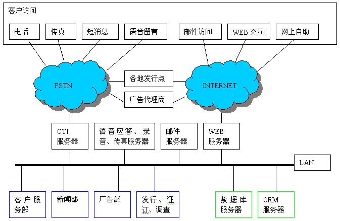 硬件方面,采用價格經濟、功能靈活的基于語音板卡的呼叫中心平臺。在軟件方面,采用高可靠性的實時LINUX操作系統(tǒng)。具有高效、穩(wěn)定、安全以及功能齊全等特點。坐席端軟件實現(xiàn)了強大電話處理功能,支持實時錄音、兼聽、強插、強拆等應用;跒g覽器的瘦客戶端與CRM的客戶界面完美融合。并且提供詳盡的報表功能。支持智能化路由、多種排隊策略的選擇,實現(xiàn)與CRM無縫結合。