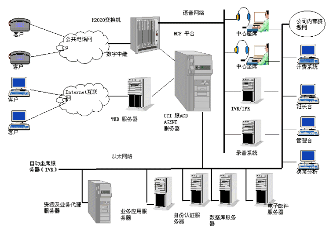 該方案完全以服務(wù)為核心,是基于軟件的呼叫中心解決方案,它采用網(wǎng)絡(luò)分布式多層對象體系,采取全媒體的接入方式,整合了從尋呼、電話、傳真、短信息到電子郵件、WEB/IP與各種資源,從而形成一個統(tǒng)一的服務(wù)平臺。