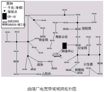 網(wǎng)絡(luò)建設(shè)的第一期工程結(jié)束后,本地多媒體寬帶骨干網(wǎng)以曲靖市政府內(nèi)的機(jī)房作為中心機(jī)房。核心機(jī)房采用支持千兆以太網(wǎng)、SDH及ATM接口的高檔交換式路由器ER-16。主干光纖沿市區(qū)鋪設(shè)成為一個星形鏈路,以便在不久的將來能夠?qū)⒂?jì)生委和人防辦的光纖連接起來形成一個環(huán)狀鏈路。市區(qū)內(nèi)共設(shè)43個光節(jié)點(diǎn),各鄉(xiāng)鎮(zhèn)有一個光節(jié)點(diǎn),以92條單模光纖直接連入核心機(jī)房的交換式路由器,由此與核心機(jī)房形成一個星狀拓?fù)浣Y(jié)構(gòu)。