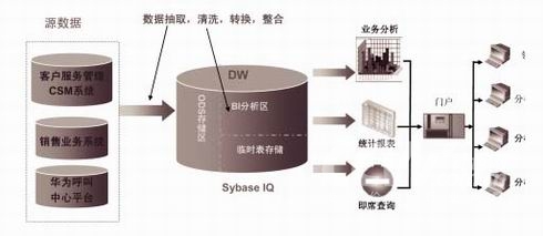 利用Sybase IQ的產(chǎn)品優(yōu)勢,我們將客戶服務(wù)管理系統(tǒng)、銷售業(yè)務(wù)系統(tǒng)、華為呼叫中心平臺的各種異構(gòu)數(shù)據(jù)庫數(shù)據(jù),通過 IQ 提供的直接數(shù)據(jù)訪問方式,逐步實施對數(shù)據(jù)的抽取、轉(zhuǎn)換及加載(ETL),最終整合到