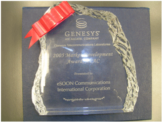 在2006年8月結(jié)束的澳洲墨爾本G-Force會(huì)議上,Genesys將 “2005年亞太地區(qū)最佳市場(chǎng)拓展”(2005 Market Development Award,APAC)獎(jiǎng)項(xiàng)授予億迅,億迅總裁李冰影女士出席頒獎(jiǎng)儀式并代表公司領(lǐng)取該獎(jiǎng)。