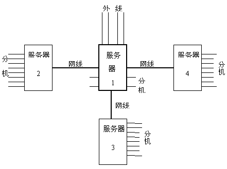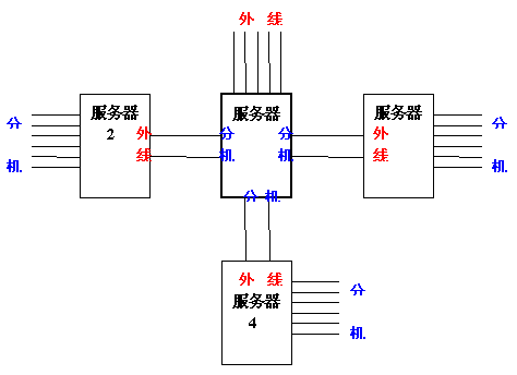 系統(tǒng)中服務(wù)器1/2/3/4之間互相通訊依靠電話線。服務(wù)器1的分機(jī)端口與服務(wù)器2/3/4的外線端口相連。所有的外線裝配在主服務(wù)器1上。