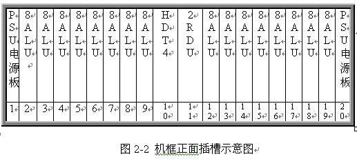 見圖 2 和 3 ,遠(yuǎn)端模塊采用 19 英寸標(biāo)準(zhǔn)機(jī)框,高度為 5U ,可安裝在各種標(biāo)準(zhǔn)的 19 英寸的機(jī)柜中。機(jī)框共 20 個(gè)插槽,正面插板,反面背板出線。每個(gè)機(jī)框可插 20 塊各種類型的板件,其中兩邊第 1 第 20 槽固定插電源板 PSU ,中間第 10 號槽固定插數(shù)字中繼接口板 HDT4 ,其余 16 個(gè)槽為通用槽口,可插 16 塊各種類型接口板。每塊板為 8 路,一個(gè)機(jī)框總共 128 話路。調(diào)度接口板 2RDU 固定插第 11 槽,該板不占機(jī)框端口。對于自帶交換系統(tǒng),需要安裝一塊系統(tǒng)信號音板 8TDU ,該板固定插 19 槽,占 8 個(gè)端口。