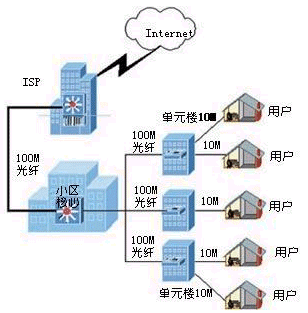 寬帶小區(qū)網(wǎng)絡(luò)建設(shè)采用基于三層交換的千兆以太技術(shù),在小區(qū)核心引入帶光口的千兆以太網(wǎng)交換機(jī),通過光纖以千兆速率上連至ISP接入?yún)^(qū)域交換機(jī)。小區(qū)內(nèi)部形成星型結(jié)構(gòu),每棟單元樓內(nèi)放置帶百兆光口的以太網(wǎng)交換機(jī),通過百兆光纖將小區(qū)核心和單元樓連接起來。樓宇內(nèi)部布放五類線,連至用戶計(jì)算機(jī)的網(wǎng)卡,使最終用戶上網(wǎng)速率達(dá)到10M或更高。