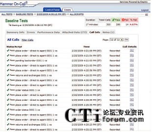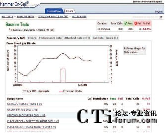 只需使用一個簡單易用的Web接入就可以和Empirix測試小組一起實(shí)時跟蹤測試進(jìn)度。此外,還同時可以查看測試結(jié)果、發(fā)生失敗的類型和導(dǎo)致失敗發(fā)生的測試流量。通話全程記錄功能可以用來記錄相關(guān)通話,從而捕獲和幫助診斷發(fā)生失敗的根源。可以參考下列圖表: