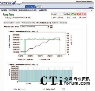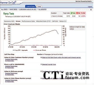 Hammer On-Call IVR測試使用各種各樣的主叫場景模擬真實(shí)世界用戶交互。通過改變呼叫量和呼叫場景的混合,Empirix測試專家可以生成指向IVR的模擬真實(shí)世界的呼叫流量。此外,在測試中,不同的呼叫測試點(diǎn)上可以使用不同的呼叫率。在測試過程中經(jīng)常會用到三種基本呼叫模型及其變體;緶y試是使用一個恒定的低呼叫率檢驗(yàn)被測環(huán)境是否已準(zhǔn)備好接受呼叫;增量測試是使用一個固定增量穩(wěn)步增加呼叫量一直到達(dá)峰值呼叫量,然后,增加呼叫量直至超過期望值,檢驗(yàn)系統(tǒng)在峰值時段內(nèi)是否有額外容量;最后,‘浸透’測試是在指定的時段內(nèi)使用一個恒定的高呼叫率檢驗(yàn)系統(tǒng)穩(wěn)定性。