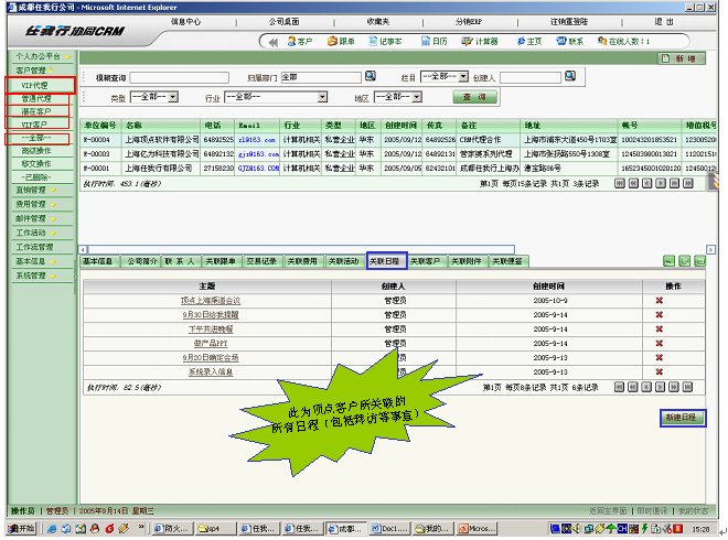 和傳統(tǒng)日程相比,傳統(tǒng)日程是不和客戶掛鉤的,事后查閱很不方便,就好比在一個(gè)筆記本上去查詢以前的筆記,要找出與某個(gè)客戶的日程安排,根本不可能,而且,很多人的備忘錄寫了之后,也不會(huì)再去翻閱了。有了客戶相關(guān)聯(lián)的日程后,以后通過(guò)客戶為入口,可以很清楚的查閱XX時(shí)候,XX人和該客戶交往的日程安排及記錄。