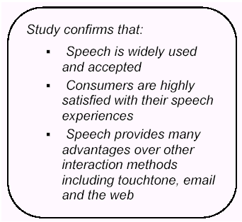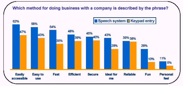 此外,十個人中九個人認為他們從使用語音服務中得到了在鍵盤式服務中得不到的價值不菲的好處,并有70%的人說如果語音服務系統(tǒng)取代了按鍵式系統(tǒng)的話,他們的效率也將得以提高。