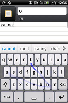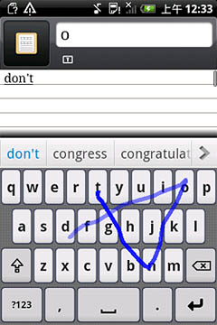 如圖所示,Nuance T9 Trace英文輸入方案對(duì)于各種不同的字母組合都能有效識(shí)別,像“google”這種既有連續(xù)又有間斷重復(fù)字母的單詞也不在話下,一次就能精準(zhǔn)輸出。另外,該輸入法還可以省去標(biāo)點(diǎn)符號(hào),如“don"t”“can"t”等單詞,用戶只需滑觸“d-o-n-t”這四個(gè)字母,輸入法就會(huì)自動(dòng)識(shí)別。