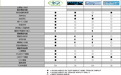 圖:Nuance T9 Trace與同類型輸入法功能對(duì)比表