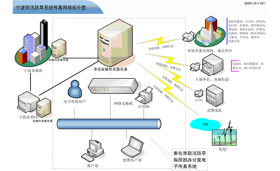 如拓樸圖所標(biāo),寧波市政府、寧波水利局與奉化市三防辦均采用了加拿大Eicon 公司與拓敏聯(lián)合推出的傳真服務(wù)器系統(tǒng),可進(jìn)行針對(duì)需求的智能設(shè)定傳真發(fā)送。
