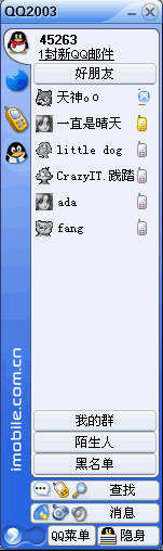 從主界面來(lái)看,MSN Messenger 6.0基本沒有改變,而QQ2003則新增加了QQ短信和QQ游戲兩個(gè)按紐,同時(shí)增加了QQ郵件提示,這和MSN