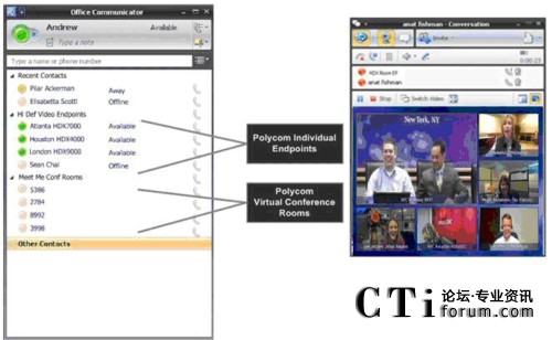 RMX 虛擬會議室出現(xiàn)在 Office Communicator 2007 聯(lián)系人列表上,用戶點擊即可加入多點通話。這樣, 商業(yè)用戶就可以在 PC 和高品質(zhì)視頻終端上輕松開展協(xié)作,并保持與各方隨時溝通。