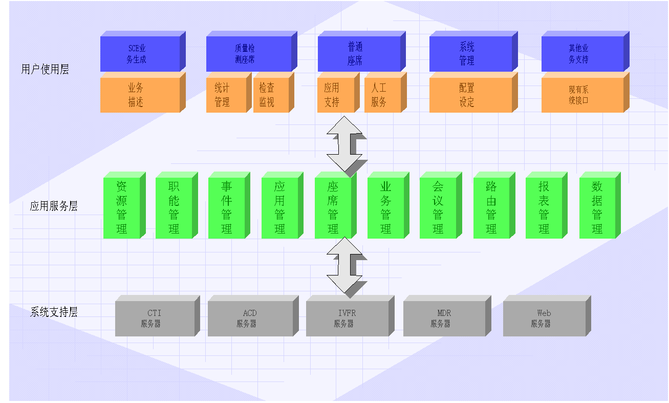 由客戶(hù)呼入組件、服務(wù)項(xiàng)目管理組件、座席管理組件、資源管理組件等多個(gè)組件共同搭建。