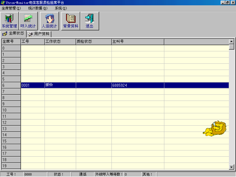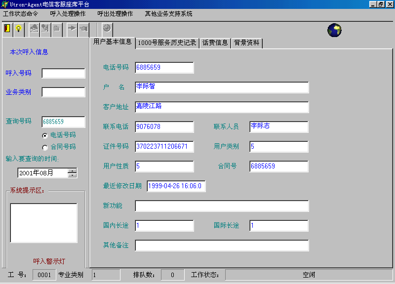 。。座席應(yīng)答時(shí),在當(dāng)前座席座席端上顯示系統(tǒng)分配的客戶(hù)隊(duì)列和在線的客戶(hù)信息。同時(shí),通過(guò)客戶(hù)管理功能,還可以對(duì)系統(tǒng)存儲(chǔ)的客戶(hù)信息進(jìn)行維護(hù)和管理。